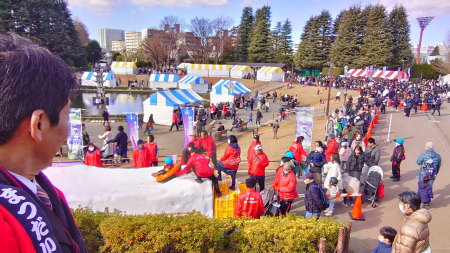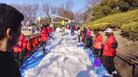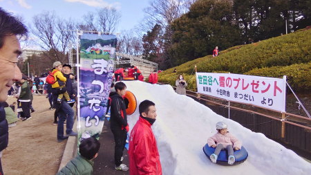 世田谷区にお招きいただき「世田谷区新年子どもまつり」に松代の雪をプレゼント。すべり台とかまくらを制作して子ども達に雪を楽しんでもらいました。あわせて松代の郷土料理「もぐら汁」も楽しんでいただけたようです。