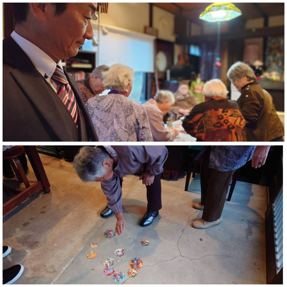 - 大先輩方のサロンにお招きいただきました。お困りごとや不安、昔話などを聞かせていただき、ラストは「めんこ」で勝負!
