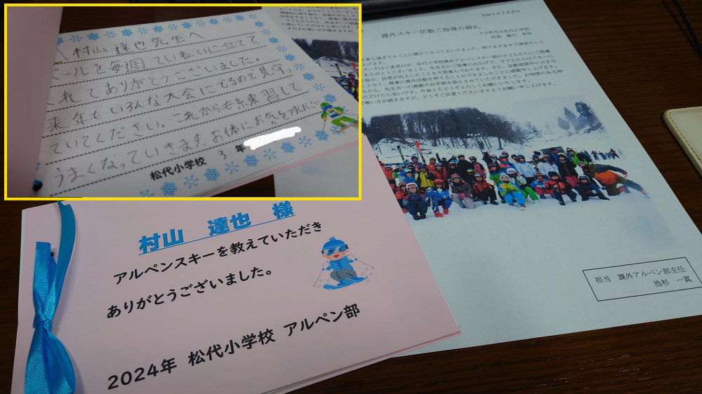 - スキー課外授業を手伝っただけなのに、子ども達からお礼の手紙集をいただきました。アルペンスキーの楽しさが子ども達に少しでも伝われば嬉しいと思い、と同時に私自身も私の子ども4人もお世話になった恩返しのつもりなので嬉しくも、恐縮しています。
