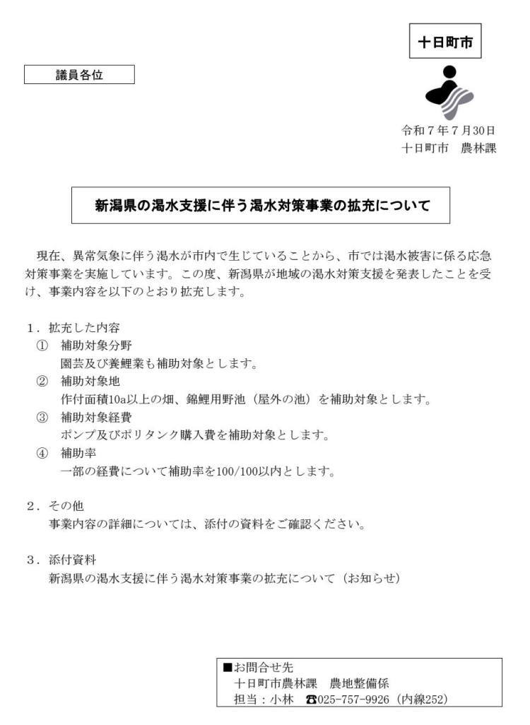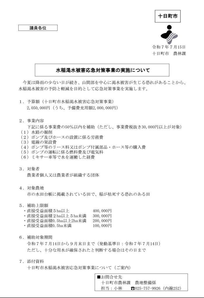 - 雨が降らない。水が欲しい。とても切実です! 新潟県も支援策を打ち出し、十日町市の支援策も拡充されました。