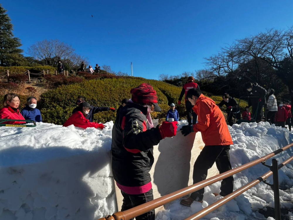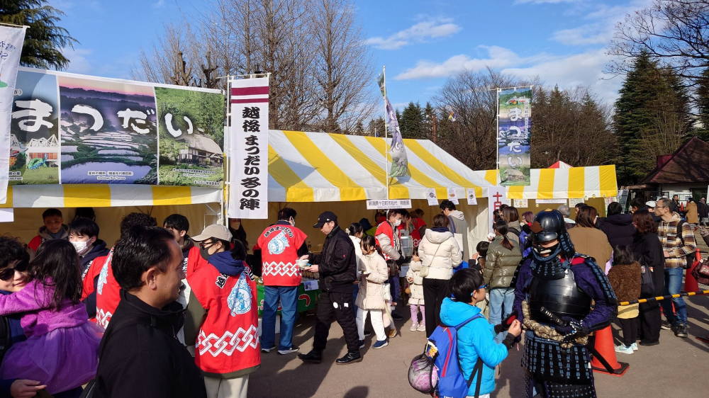 - およそ30年前から続く都市間交流で、世田谷区の新年こどもまつりにお招きいただきました。松代の雪を30トン持参し、雪の滑り台&かまくらを製作し子ども達に楽しんでもらったのですが、滑り台には約2時間の行列、かまくらには約1時間半の行列。もぐら汁にも長蛇の列となり大盛況。