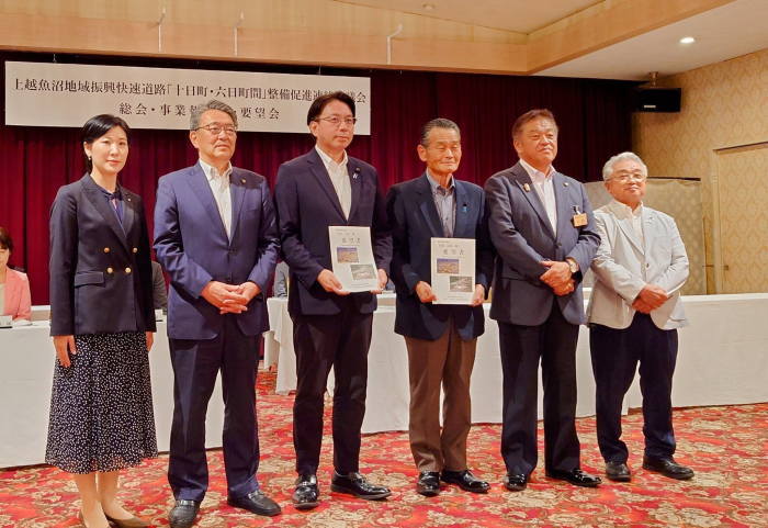 - 上沼道の「十日町〜六日町間」を早く完成していただきたい。という思いの整備促進連絡協議会に出席。私からは「松代インターから乗り、信濃川に掛かる長大橋を自分の運転で渡りたい。横に孫を乗せて」という夢を語らせていただきました。