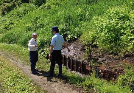 斜面が崩れ水路を塞いでいる状態でしたので、担当課に相談。 なかなか条件が難しい場所でしたが今後に注視してまいります。